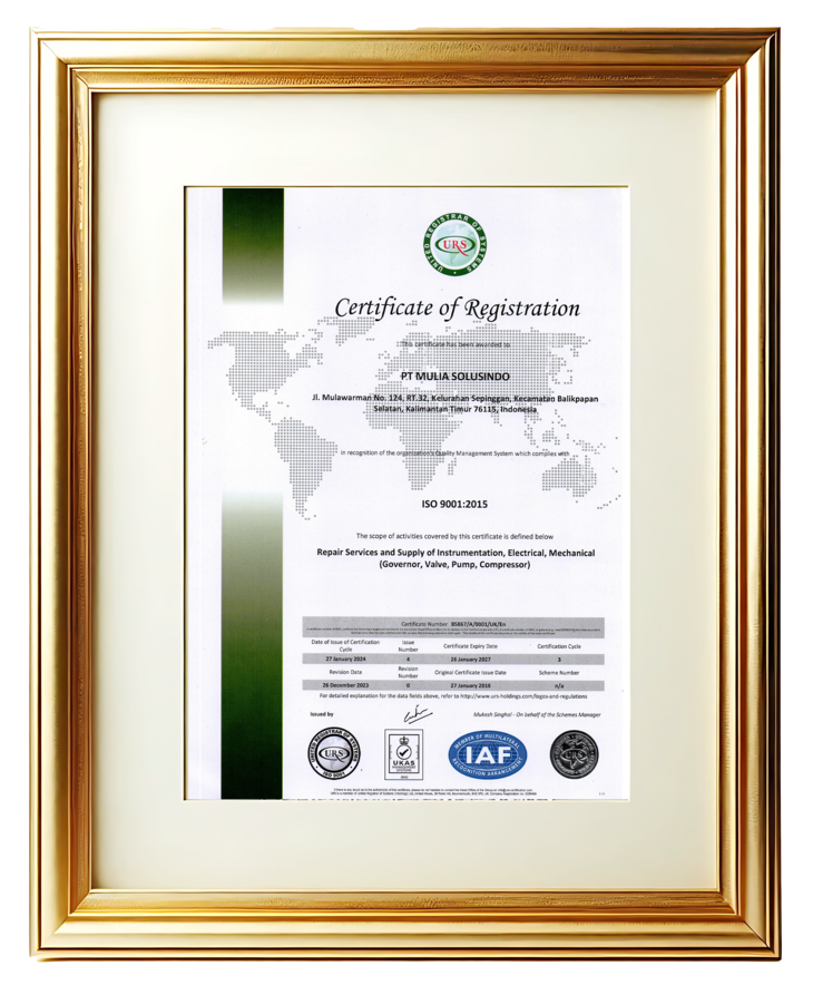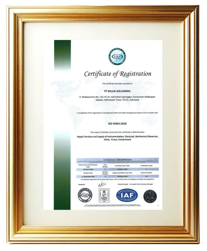 ISO 45001:2018 menunjukkan bahwa PT Mulia Solusindo telah menerapkan Sistem Manajemen Keselamatan dan Kesehatan Kerja (K3) secara menyeluruh, memastikan setiap aktivitas operasional — baik di workshop maupun di lapangan — berjalan aman, efisien, dan meminimalkan risiko terhadap tenaga kerja serta lingkungan.